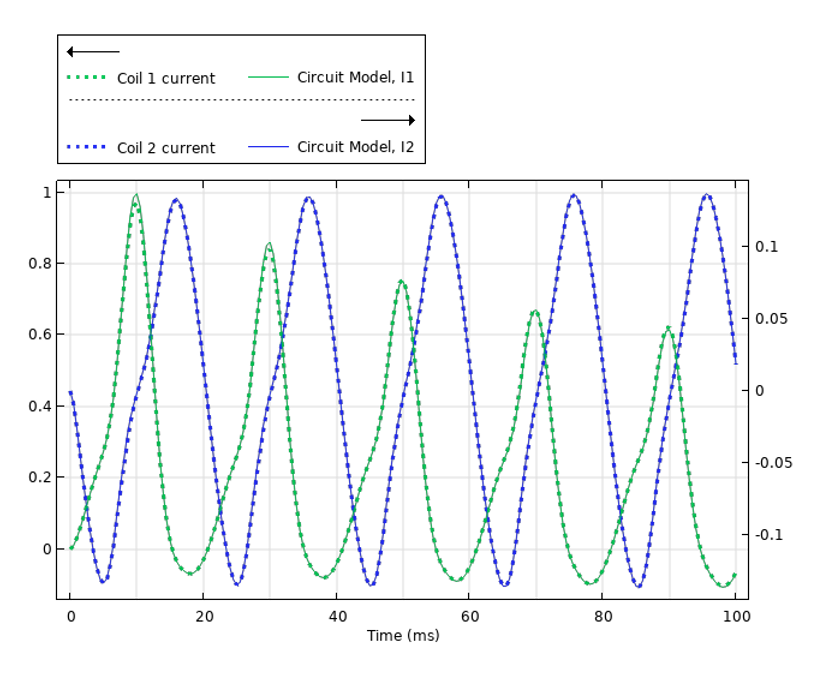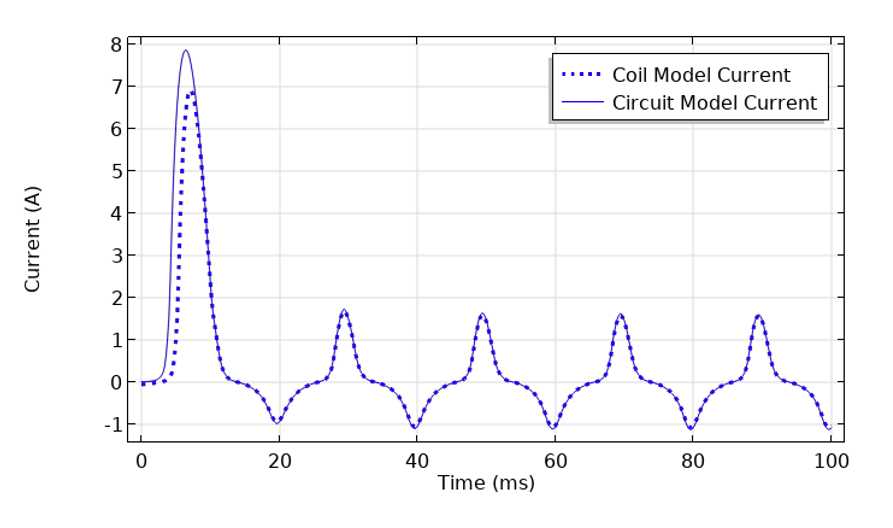 Plot of the current through the inductor with an AC voltage source applied. Results of the electrical circuit and magnetic fields models agree.