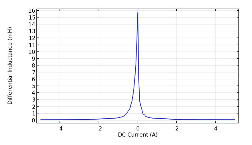 Differential and secant inductance of the inductor with a nonlinear magnetic core material over a range of applied DC currents.