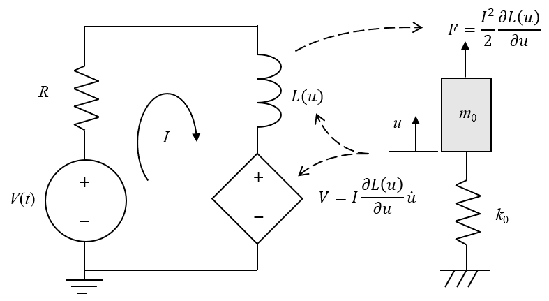 A spring holds the plunger in its equilibrium position outside of the housing. When a voltage is applied to the coil, current starts to flow and forces the plunger towards the center. In this situation, there is no material nonlinearity, so the concatenated flux is linearly dependent upon the time-varying current, I, but changes nonlinearly with u, the plunger z-position: