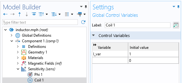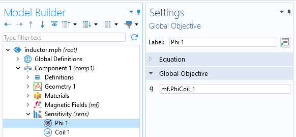 To compute the differential inductance, we need to evaluate the derivative of the coil concatenated flux in all coils with respect to the applied current in the primary. This can be done with the Sensitivity interface, which we’ve previously covered in our blog post “Computing Design Sensitivities in COMSOL Multiphysics®” and will briefly review. The usage of this interface begins with defining a Global Objective feature, where we enter the expression for the coil concatenated flux. We also need to define at least one Global Control Variable, which is a variable used for taking the differential of the objective. Here, we enter a variable name that multiplies the DC current flowing through the primary. With this setup, the Sensitivity study step can be combined with an Auxiliary Sweep over the applied current, and the differential inductance over a range of applied currents can be computed.