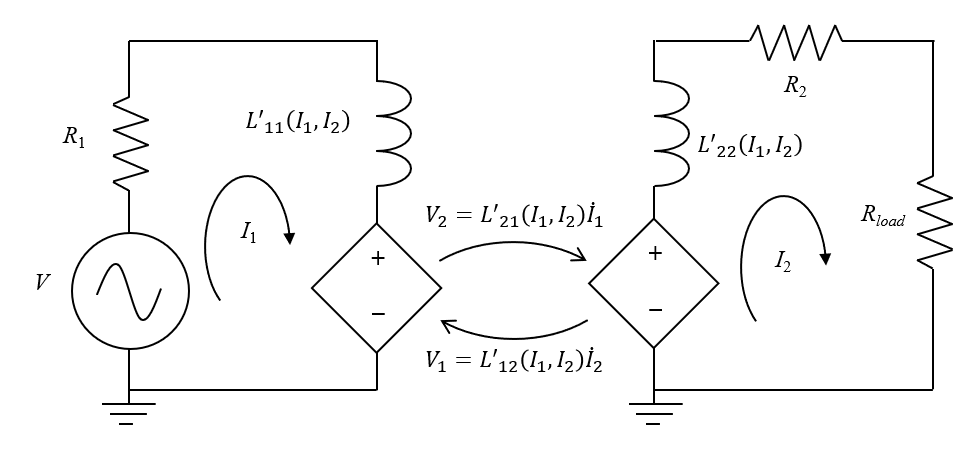 Once these two differential inductances are computed, a set of functions is used to define all four terms of the mutual inductance matrix. These terms can be used within an electrical circuit model of the same transformer. Due to the nonlinearity, the coupling between the two coils is modeled with a Current-Controlled Voltage Source feature, as illustrated in the figure below.